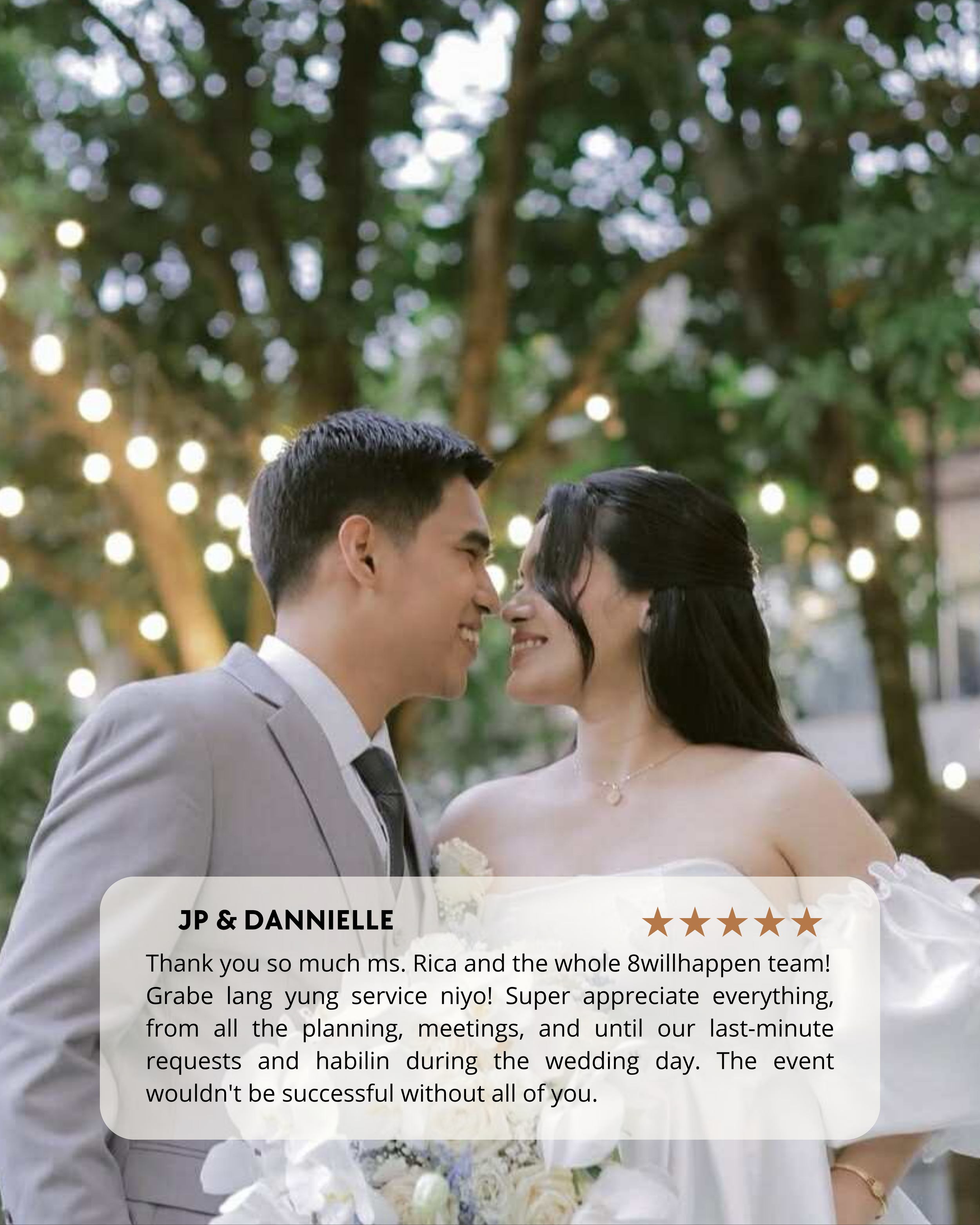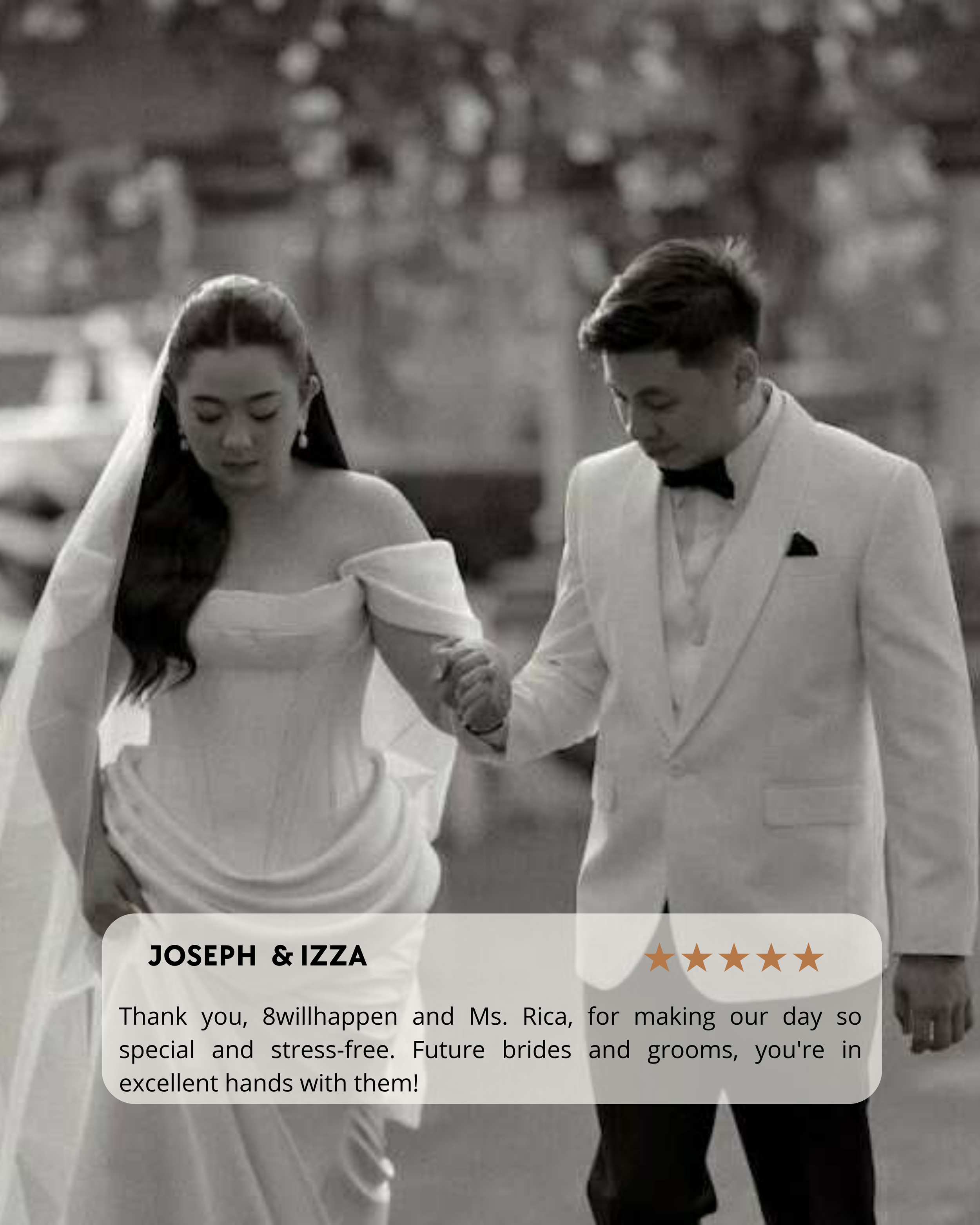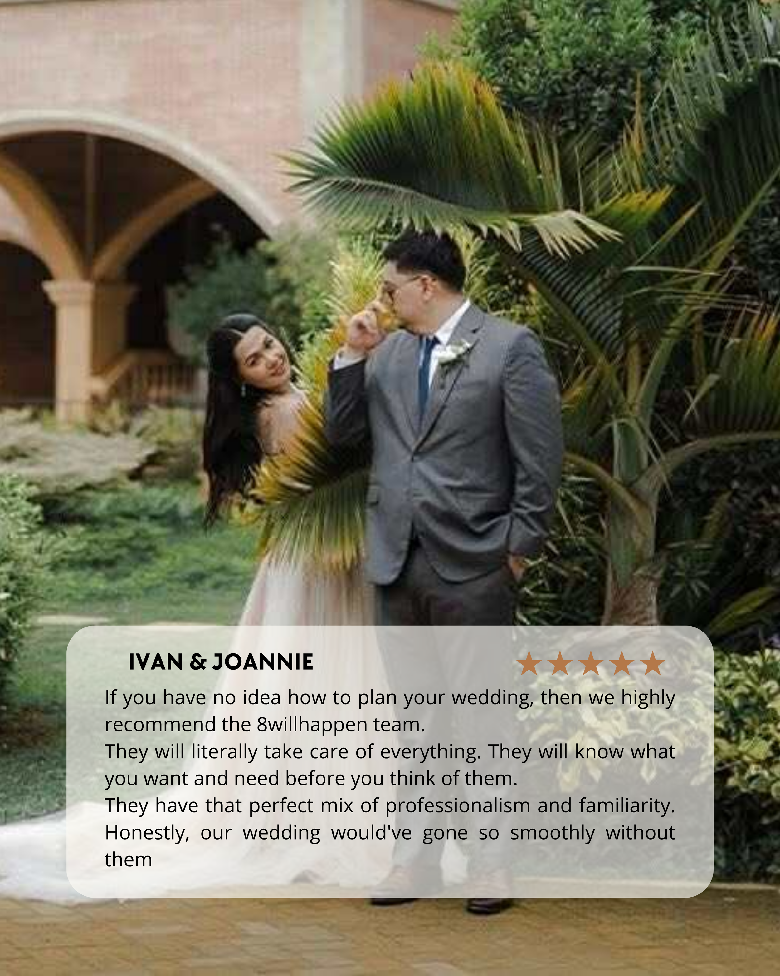 From intimate gatherings to grand weddings, our clients’ feedback fuels what we do. Read the genuine reviews that celebrate the work, passion, and dedication behind 8willhappen.