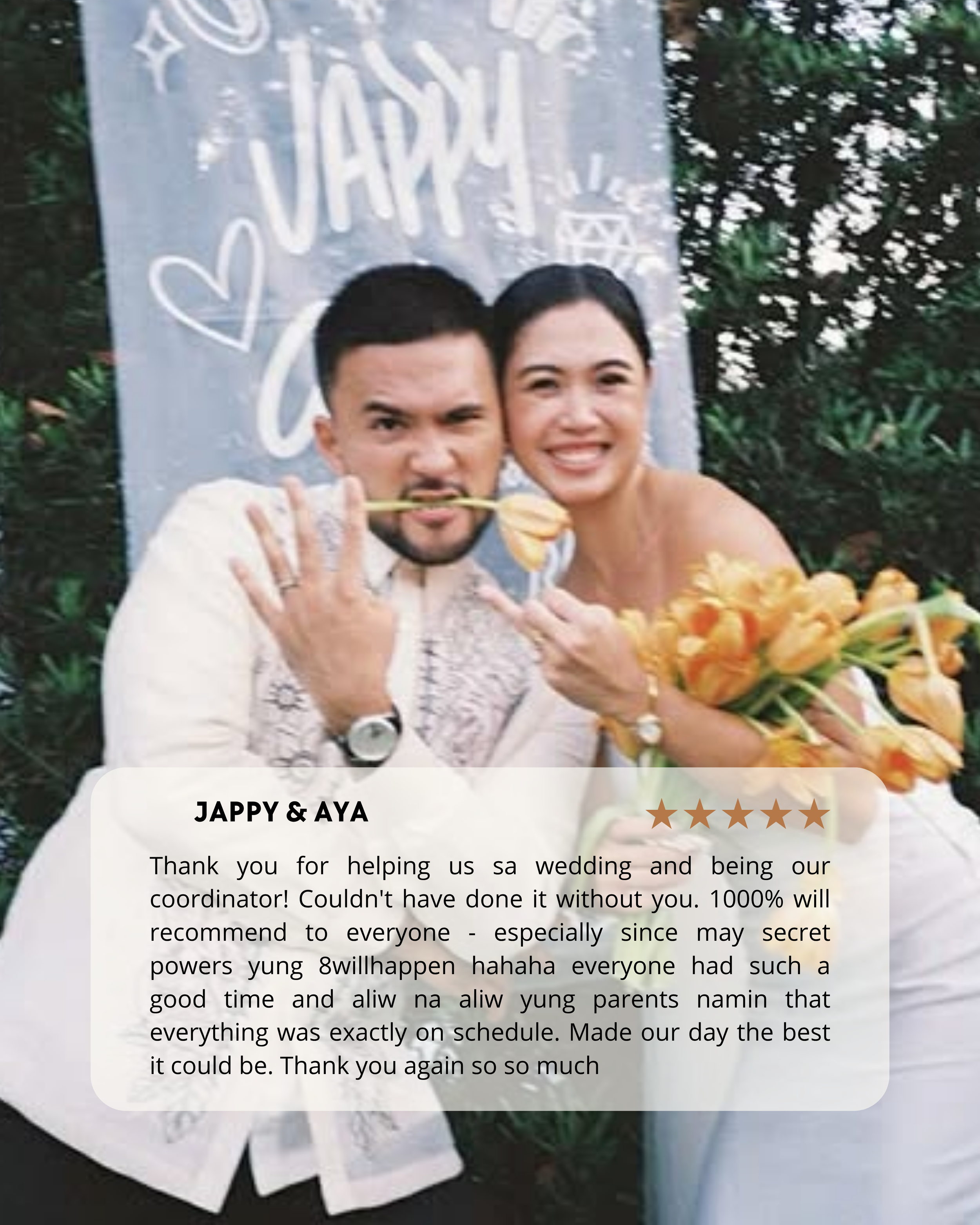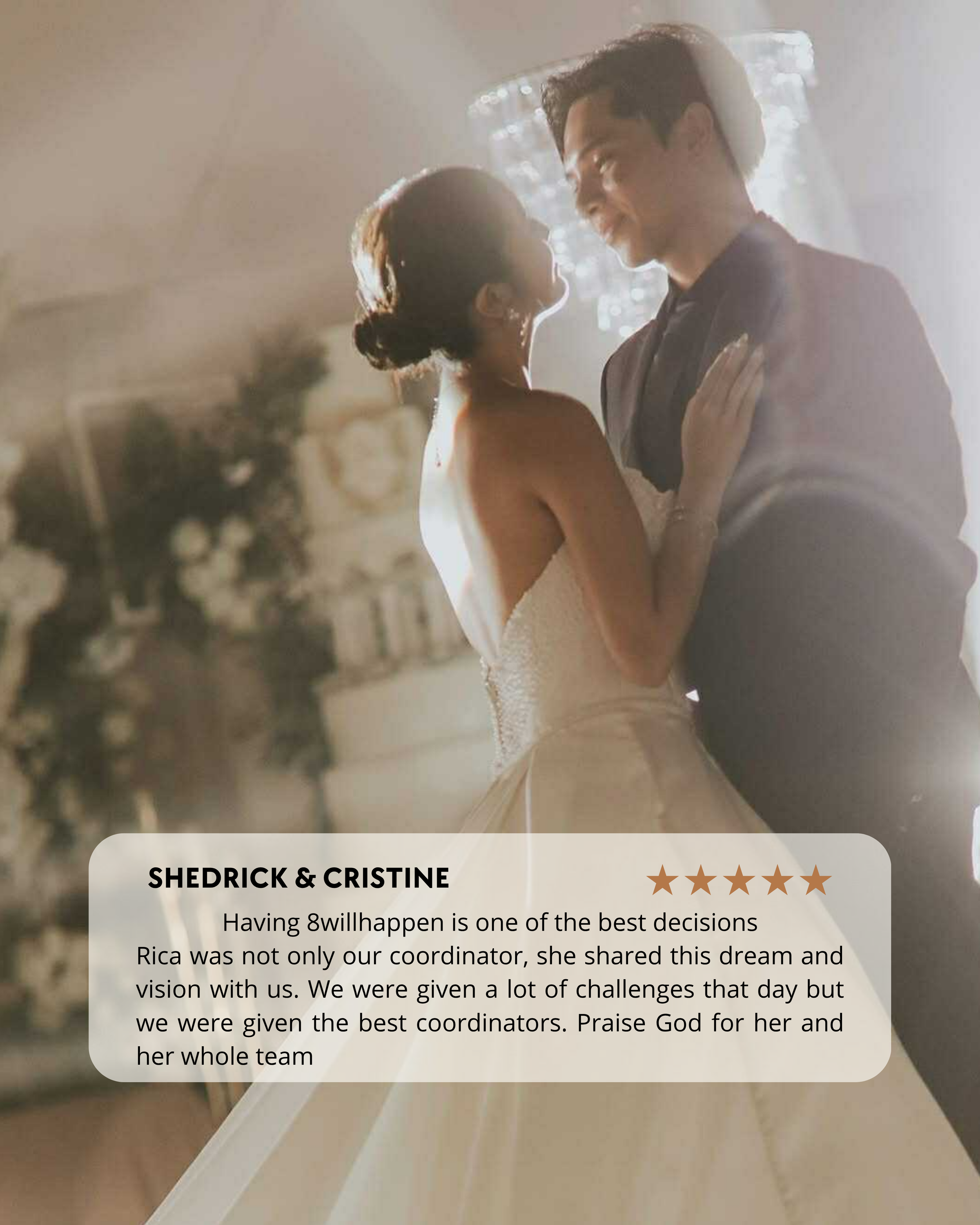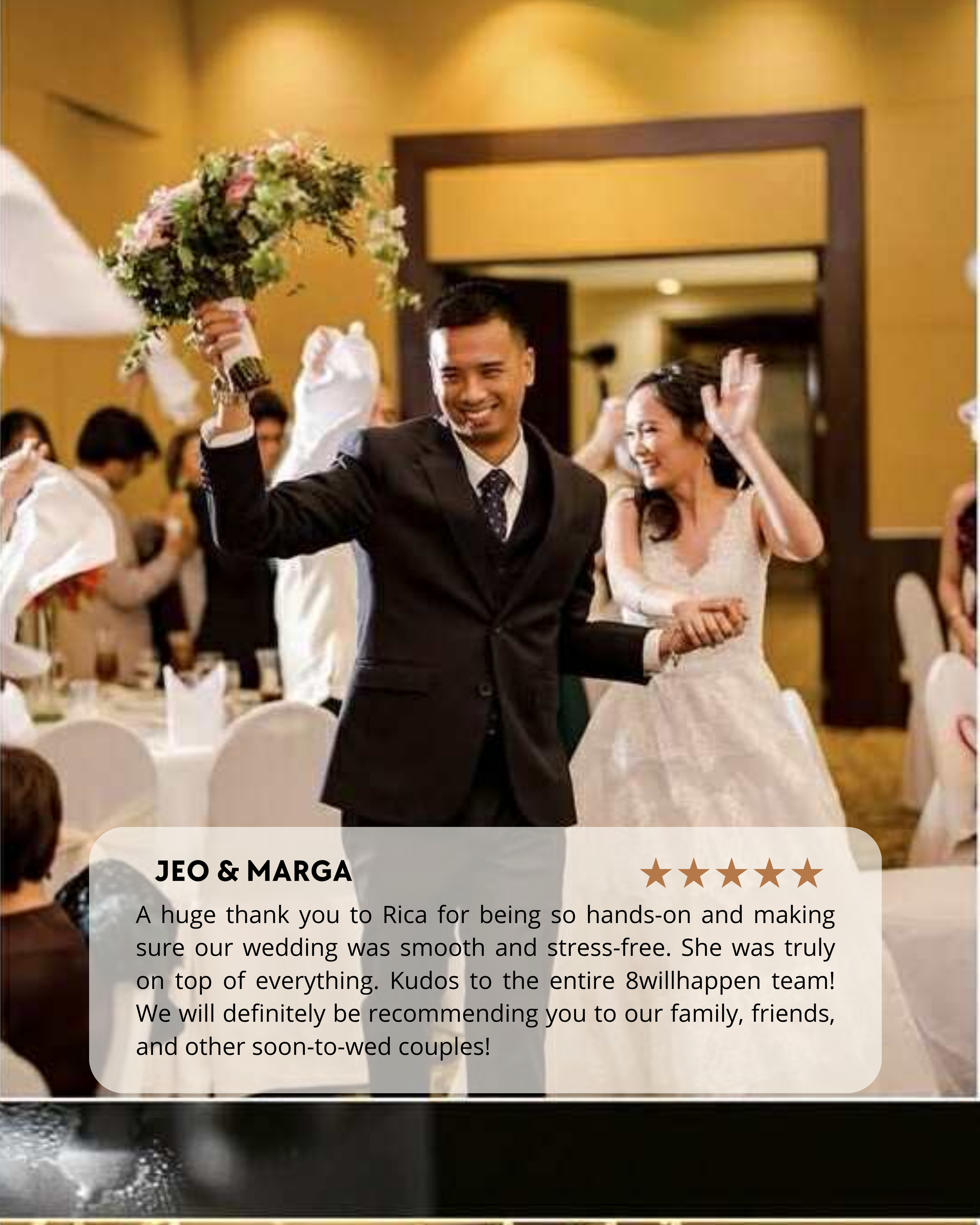 From intimate gatherings to grand weddings, our clients’ feedback fuels what we do. Read the genuine reviews that celebrate the work, passion, and dedication behind 8willhappen.